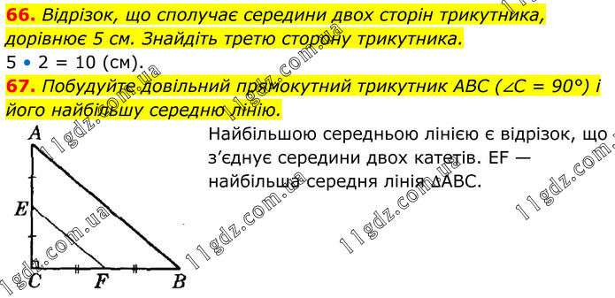 66. Відрізок, що сполучає середини двох сторін трикутника, дорівнює 5 см. Знайдіть третю сторону трикутника. 5 • 2 = 10 (см). 67. Побудуйте довільний прямокутний трикутник ABC (∠C = 90°) і його найбільшу середню лінію. Найбільшою середньою лінією є відрізок, що з’єднує середини двох катетів. EF — найбільша середня лінія ∆ABC.