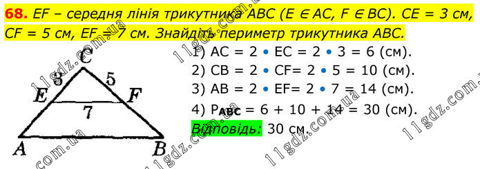 68. EF – середня лінія трикутника ABC (E ∈ AC, F ∈ BC). CE = 3 см, CF = 5 см, EF = 7 см. Знайдіть периметр трикутника ABC. 1) AC = 2 • EC = 2 • 3 = 6 (см). 2) CB = 2 • CF= 2 • 5 = 10 (см). 3) AB = 2 • EF= 2 • 7 = 14 (см). 4) PABC = 6 + 10 + 14 = 30 (см). Відповідь: 30 см.