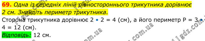 69. Одна із середніх ліній рівностороннього трикутника дорівнює 2 см. Знайдіть периметр трикутника. Сторона трикутника дорівнює 2 • 2 = 4 (см), а його периметр P = 3 • 4 = 12 (см). Відповідь: 12 см.