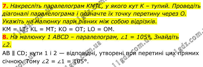 7. Накресліть паралелограм KMTL, у якого кут K – тупий. Проведіть діагоналі паралелограма і позначте їх точку перетину через O. Укажіть на малюнку пари рівних між собою відрізків. KM = LT; KL = MT; KO = ОТ; LO = ОМ. 8. На малюнку 1 ABCD – паралелограм, ∠1 = 105°. Знайдіть ∠2. AB ∥ CD; кути 1 і 2 — відповідні, утворені при перетині цих прямих січною. Тому ∠2 = ∠1 = 105°.