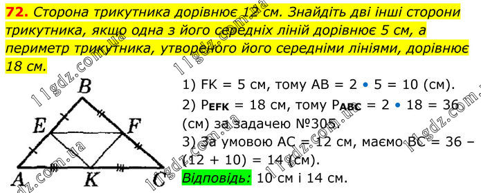 72. Сторона трикутника дорівнює 12 см. Знайдіть дві інші сторони трикутника, якщо одна з його середніх ліній дорівнює 5 см, а периметр трикутника, утвореного його середніми лініями, дорівнює 18 см. 1) FK = 5 см, тому AB = 2 • 5 = 10 (см). 2) PEFK = 18 см, тому PABC = 2 • 18 = 36 (см) за задачею №9.13. 3) За умовою AC = 12 см, маємо BC = 36 – (12 + 10) = 14 (см). Відповідь: 10 см і 14 см.