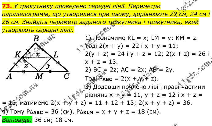 73. У трикутнику проведено середні лінії. Периметри паралелограмів, що утворилися при цьому, дорівнюють 22 см, 24 см і 26 см. Знайдіть периметр заданого трикутника і трикутника, який утворюють середні лінії. 1) Позначимо KL = х; LM = у; KM = z. Тоді 2(х + у) = 22 i x + y = 11; 2(y + z) = 24 i y + z = 12; 2(x + z) = 26 і х + z = 13. 2) BC = 2z; AC = 2х; AB = 2у. Тоді PABC = 2(х + у + z). 3) Додавши почлено ліві і праві частини рівнянь х + у = 11, у + z = 12 і х + z = = 13, матимемо 2(х + у + z) = 11 + 12 + 13; 2(х + у + z) = 36. 4) Тому P∆ABC = 36 (см), P∆KLM = х + у + z = 18 (см). Відповідь: 36 см; 18 см.