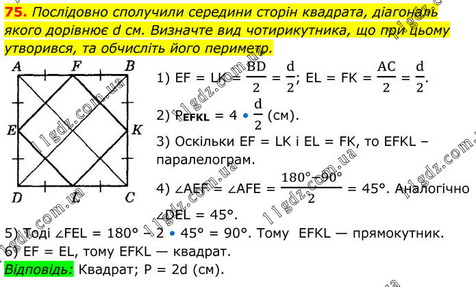 75. Послідовно сполучили середини сторін квадрата, діагональ якого дорівнює d см. Визначте вид чотирикутника, що при цьому утворився, та обчисліть його периметр. 1) EF = LK = BD/2 = d/2; EL = FK = AC/2 = d/2. 2) PEFKL = 4 • d/2 (см). 3) Оскільки EF = LK i EL = FK, то EFKL – паралелограм. 4) ∠AEF = ∠AFE = (180°-90°)/2 = 45°. Аналогічно ∠DEL = 45°. 5) Тоді ∠FEL = 180° – 2 • 45° = 90°. Тому EFKL — прямокутник. 6) EF = EL, тому EFKL — квадрат. Відповідь: Квадрат; P = 2d (см).