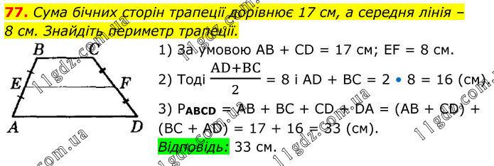 77. Сума бічних сторін трапеції дорівнює 17 см, а середня лінія – 8 см. Знайдіть периметр трапеції. 1) За умовою АВ + CD = 17 см; EF = 8 см. 2) Тоді (AD+BC)/2 = 8 і AD + BC = 2 • 8 = 16 (см). 3) PABCD = AB + BC + CD + DA = (AB + CD) + (BC + AD) = 17 + 16 = 33 (см). Відповідь: 33 см.