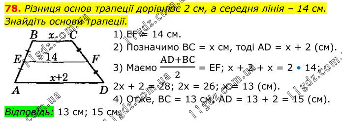 78. Різниця основ трапеції дорівнює 2 см, а середня лінія – 14 см. Знайдіть основи трапеції. 1) EF = 14 см. 2) Позначимо BC = х см, тоді AD = х + 2 (см). 3) Маємо (AD+BC)/2 = EF; x + 2 + x = 2 • 14; 2х + 2 = 28; 2х = 26; х = 13 (см). 4) Отже, BC = 13 см; AD = 13 + 2 = 15 (см). Відповідь: 13 см; 15 см.