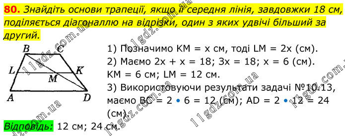 80. Знайдіть основи трапеції, якщо її середня лінія, завдовжки 18 см, поділяється діагоналлю на відрізки, один з яких удвічі більший за другий. 1) Позначимо KM = х см, тоді LM = 2х (см). 2) Маємо 2х + х = 18; Зх = 18; х = 6 (см). KM = 6 см; LM = 12 см. 3) Використовуючи результати задачі №10.13, маємо BC = 2 • 6 = 12 (см); AD = 2 • 12 = 24 (см). Відповідь: 12 см; 24 см.