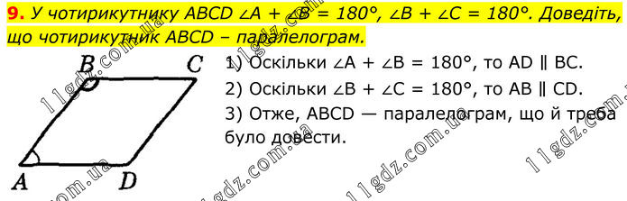 9. У чотирикутнику ABCD ∠A + ∠B = 180°, ∠B + ∠C = 180°. Доведіть, що чотирикутник ABCD – паралелограм. 1) Оскільки ∠A + ∠B = 180°, то AD ∥ BC. 2) Оскільки ∠B + ∠C = 180°, то AB ∥ CD. 3) Отже, ABCD — паралелограм, що й треба було довести.