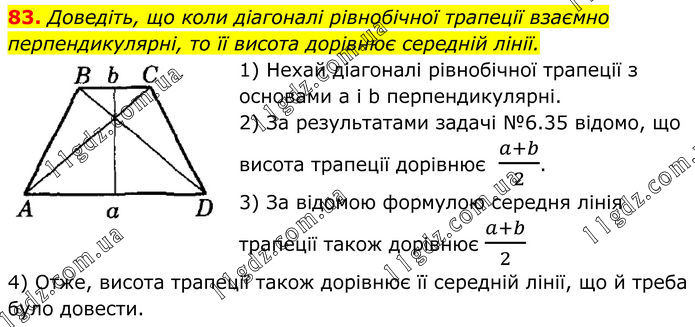 83. Доведіть, що коли діагоналі рівнобічної трапеції взаємно перпендикулярні, то її висота дорівнює середній лінії. 1) Нехай діагоналі рівнобічної трапеції з основами а і b перпендикулярні. 2) За результатами задачі №6.35 відомо, що висота трапеції дорівнює (a+b)/2. 3) За відомою формулою середня лінія трапеції також дорівнює (a+b)/2 4) Отже, висота трапеції також дорівнює її середній лінії, що й треба було довести.