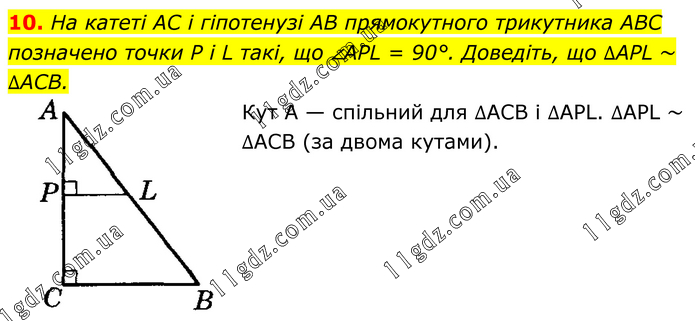 10. На катеті AC і гіпотенузі AB прямокутного трикутника ABC позначено точки P і L такі, що ∠APL = 90°. Доведіть, що ∆APL ~ ∆ACB. Кут А — спільний для ∆ACB і ∆APL. ∆APL ~ ∆ACB (за двома кутами).