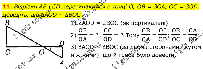 11. Відрізки AB і CD перетинаються в точці O, OB = 3OA, OC = 3OD. Доведіть, що ∆AOD ~ ∆BOC. 1) ∠AOD = ∠BOC (як вертикальні). 2) OB/OA = 3; OC/OD = 3 Тому OB/OA = OC/OD; OB/OC = OA/OD. 3) ∆AOD ~ ∆BOC (за двома сторонами і кутом між ними), що й треба було довести.