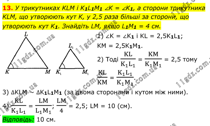 13. У трикутниках KLM і K1L1M1 ∠K = ∠K1, а сторони трикутника KLM, що утворюють кут K, у 2,5 раза більші за сторони, що утворюють кут K1. Знайдіть LM, якщо L1M1 = 4 см. 1) ∠K = ∠K1 i KL = 2,5K1L1; KM = 2,5K1M1. 2) Тоді KL/(K_1 L_1 ) = KM/(K_1 M_1 ) = 2,5 тому KL/KM = (K_1 L_1)/(K_1 M_1 ). 3) ∆KLM ~ ∆K1L1M1 (за двома сторонами і кутом між ними). 4) KL/(K_1 L_1 ) = LM/(L_1 M_1 ); LM/4 = 2,5; LM = 10 (см). Відповідь: 10 см.
