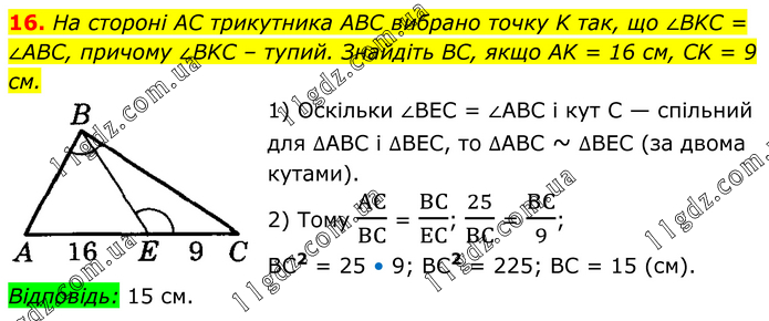 16. На стороні AC трикутника ABC вибрано точку K так, що ∠BKC = ∠ABC, причому ∠BKC – тупий. Знайдіть BC, якщо AK = 16 см, CK = 9 см. 1) Оскільки ∠BEC = ∠ABC і кут C — спільний для ∆ABC і ∆ВЕС, то ∆ABC ~ ∆BEC (за двома кутами). 2) Тому AC/BC = BC/EC; 25/BC = BC/9; BC2 = 25 • 9; BC2 = 225; BC = 15 (см). Відповідь: 15 см.