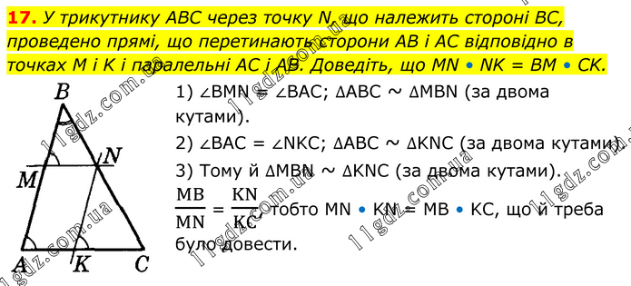 17. У трикутнику ABC через точку N, що належить стороні BC, проведено прямі, що перетинають сторони AB і AC відповідно в точках M і K і паралельні AC і AB. Доведіть, що MN • NK = BM • CK. 1) ∠BMN = ∠BAC; ∆ABC ~ ∆MBN (за двома кутами). 2) ∠BAC = ∠NKC; ∆ABC ~ ∆KNC (за двома кутами). 3) Тому й ∆MBN ~ ∆KNC (за двома кутами). MB/MN = KN/KC, тобто MN • KN = MB • KC, що й треба було довести.