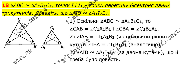18. ∆ABC ~ ∆A1B1C1, точки I і I1 – точки перетину бісектрис даних трикутників. Доведіть, що ∆AIB ~ ∆A1I1B1. 1) Оскільки ∆ABC ~ ∆A1B1C1, то ∠CAB = ∠C1A1B1 і ∠CBA = ∠C1B1A1. 2) ∠lAB = ∠I1A1B1 (як половини рівних кутів); ∠IBA = ∠I1B1A1 (аналогічно). 3) ∆AIB ~ ∆A1I1B1 (за двома кутами), що й треба було довести.