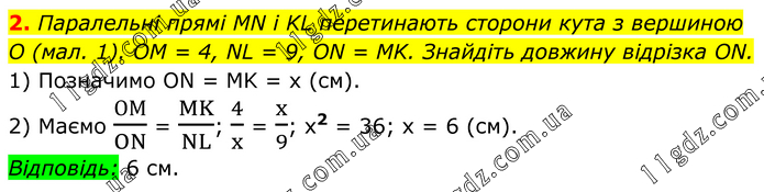 2. Паралельні прямі MN і KL перетинають сторони кута з вершиною O (мал. 1). OM = 4, NL = 9, ON = MK. Знайдіть довжину відрізка ON. 1) Позначимо ON = MK = x (см). 2) Маємо ОМ/ON = MK/NL; 4/x = x/9; x2 = 36; x = 6 (см). Відповідь: 6 см.