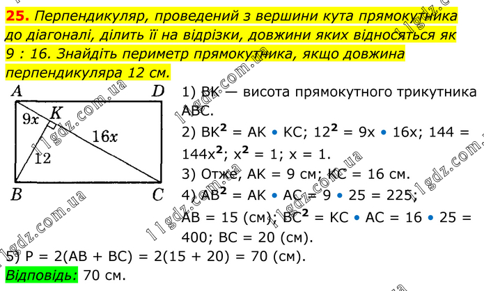 25. Перпендикуляр, проведений з вершини кута прямокутника до діагоналі, ділить її на відрізки, довжини яких відносяться як 9 : 16. Знайдіть периметр прямокутника, якщо довжина перпендикуляра 12 см. 1) BK — висота прямокутного трикутника ABC. 2) BK2 = AK • KC; 122 = 9х • 16х; 144 = 144x2; х2 = 1; х = 1. 3) Отже, AK = 9 см; KC = 16 см. 4) AB2 = AK • AC = 9 • 25 = 225; AB = 15 (см); BC2 = KC • AC = 16 • 25 = 400; BC = 20 (см). 5) P = 2(АВ + BС) = 2(15 + 20) = 70 (см). Відповідь: 70 см.