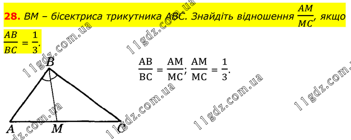 28. BM – бісектриса трикутника ABC. Знайдіть відношення AM/MC, якщо AB/BC = 1/3. AB/BC = AM/MC; AM/MC = 1/3.