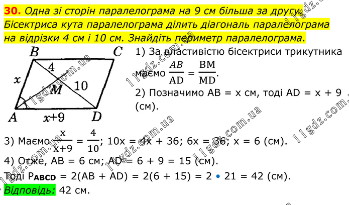 Одна зі сторін паралелограма на 9 см більша за другу. Бісектриса кута паралелограма ділить діагональ паралелограма на відрізки 4 см і 10 см. Знайдіть периметр паралелограма. 1) За властивістю бісектриси трикутника маємо AB/AD = BM/MD. 2) Позначимо AB = х см, тоді AD = х + 9 (см). 3) Маємо x/(x+9) = 4/10; 10x = 4х + 36; 6х = 36; х = 6 (см). 4) Отже, AB = 6 см; AD = 6 + 9 = 15 (см). Тоді PABCD = 2(АВ + AD) = 2(6 + 15) = 2 • 21 = 42 (см). Відповідь: 42 см.