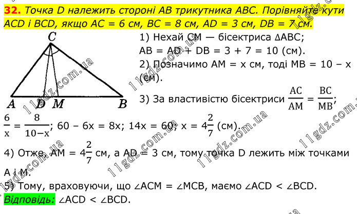 Точка D належить стороні AB трикутника ABC. Порівняйте кути ACD і BCD, якщо AC = 6 см, BC = 8 см, AD = 3 см, DB = 7 см. 1) Нехай CM — бісектриса ∆АВС; AB = AD + DB = 3 + 7 = 10 (см). 2) Позначимо AM = х см, тоді MB = 10 – х (см). 3) За властивістю бісектриси АС/АМ = ВС/МВ; 6/х = 8/(10-х); 60 – 6х = 8х; 14х = 60; х = 42/7 (см). 4) Отже, AM = 42/7 см, a AD = 3 см, тому точка D лежить між точками A i M. 5) Тому, враховуючи, що ∠ACM = ∠MCB, маємо ∠ACD < ∠BCD. Відповідь: ∠ACD < ∠BCD.