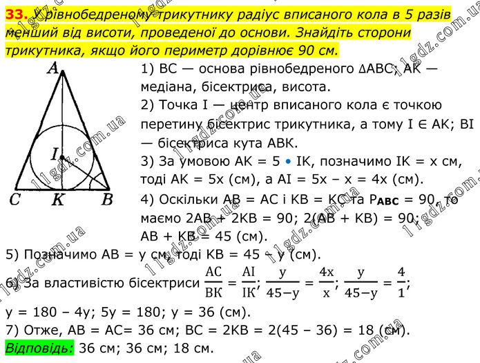 У рівнобедреному трикутнику радіус вписаного кола в 5 разів менший від висоти, проведеної до основи. Знайдіть сторони трикутника, якщо його периметр дорівнює 90 см. 1) BC — основа рівнобедреного ∆АВС; AK — медіана, бісектриса, висота. 2) Точка І — центр вписаного кола є точкою перетину бісектрис трикутника, а тому І ∈ AK; BI — бісектриса кута АВК. 3) За умовою AK = 5 • IK, позначимо IK = х см, тоді AK = 5х (см), a AI = 5х – х = 4х (см). 4) Оскільки AB = AC і KB = KC та PАВС = 90, то маємо 2AB + 2KB = 90; 2(AB + KB) = 90; AB + KB = 45 (см). 5) Позначимо AB = у см, тоді KB = 45 – у (см). 6) За властивістю бісектриси АС/ВК = АІ/ІК; у/(45-у) = 4х/х; у/(45-у) = 4/1; у = 180 – 4у; 5у = 180; у = 36 (см). 7) Отже, AB = AC= 36 см; BC = 2KB = 2(45 – 36) = 18 (см). Відповідь: 36 см; 36 см; 18 см.
