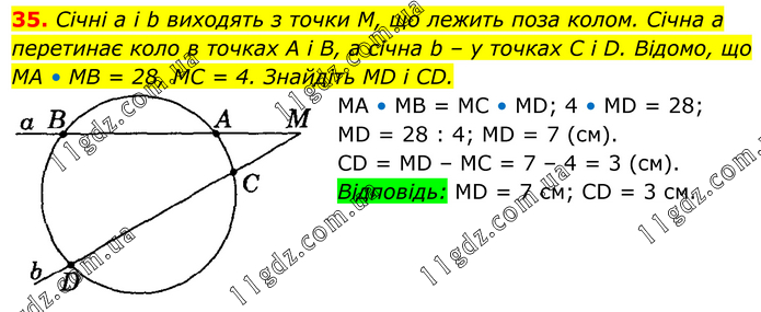 Січні a і b виходять з точки M, що лежить поза колом. Січна a перетинає коло в точках A і B, а січна b – у точках C і D. Відомо, що MA • MB = 28, MC = 4. Знайдіть MD і CD. MA • MB = MC • MD; 4 • MD = 28; MD = 28 : 4; MD = 7 (см). CD = MD – MC = 7 – 4 = 3 (см). Відповідь: MD = 7 см; CD = 3 см.