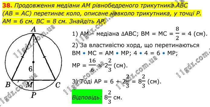 Продовження медіани AM рівнобедреного трикутника ABC (AB = AC) перетинає коло, описане навколо трикутника, у точці P. AM = 6 см, BC = 8 см. Знайдіть AP. 1) AM – медіана ∆АВС; BM = MC = 8/2 = 4 (см). 2) За властивістю хорд, що перетинаються BM • MC = AM • MP; 4 • 4 = 6 • MP; MP = 16/6 = 22/3 (см). 3) Тоді AP = 6 + 22/3 = 82/3 (см). Відповідь: 82/3 см.