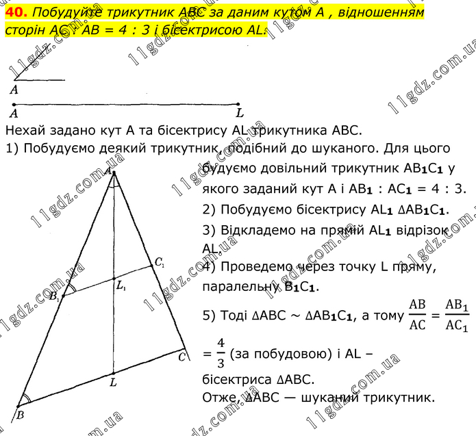 Побудуйте трикутник ABC за даним кутом A , відношенням сторін AC : AB = 4 : 3 і бісектрисою AL. Нехай задано кут А та бісектрису AL трикутника ABC. 1) Побудуємо деякий трикутник, подібний до шуканого. Для цього будуємо довільний трикутник AB1C1 у якого заданий кут А і AB1 : AC1 = 4 : 3. 2) Побудуємо бісектрису AL1 ∆AB1C1. 3) Відкладемо на прямій AL1 відрізок AL. 4) Проведемо через точку L пряму, паралельну В1C1. 5) Тоді ∆ABC ~ ∆AB1C1, а тому АВ/АС = (АВ_1)/(АС_1 ) = 4/3 (за побудовою) і AL – бісектриса ∆ABC. Отже, ∆ABC — шуканий трикутник.