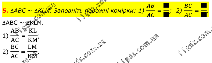 5. ∆ABC ~ ∆KLM. Заповніть порожні комірки: 1) AB/AC = /; 2) BC/AC = /. ∆ABC ~ ∆KLM. 1) AB/AC = KL/KM; 2) BC/AC = LM/KM.