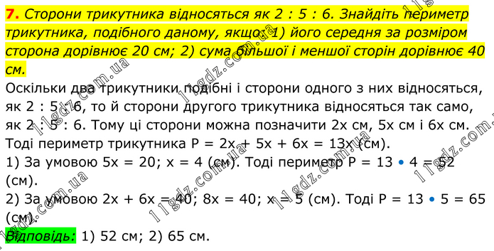 7. Сторони трикутника відносяться як 2 : 5 : 6. Знайдіть периметр трикутника, подібного даному, якщо: 1) його середня за розміром сторона дорівнює 20 см; 2) сума більшої і меншої сторін дорівнює 40 см. Оскільки два трикутники подібні і сторони одного з них відносяться, як 2 : 5 : 6, то й сторони другого трикутника відносяться так само, як 2 : 5 : 6. Тому ці сторони можна позначити 2х см, 5х см і 6х см. Тоді периметр трикутника P = 2х + 5х + 6х = 1Зх (см). 1) За умовою 5х = 20; х = 4 (см). Тоді периметр P = 13 • 4 = 52 (см). 2) За умовою 2х + 6х = 40; 8х = 40; х = 5 (см). Тоді P = 13 • 5 = 65 (см). Відповідь: 1) 52 см; 2) 65 см.