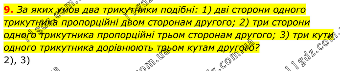 9. За яких умов два трикутники подібні: 1) дві сторони одного трикутника пропорційні двом сторонам другого; 2) три сторони одного трикутника пропорційні трьом сторонам другого; 3) три кути одного трикутника дорівнюють трьом кутам другого? 2), 3).