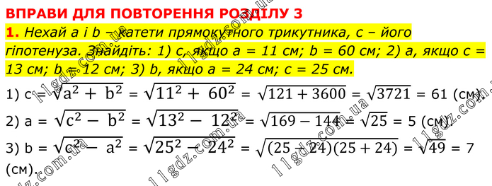 ВПРАВИ ДЛЯ ПОВТОРЕННЯ РОЗДІЛУ 3 1. Нехай a і b – катети прямокутного трикутника, c – його гіпотенуза. Знайдіть: 1) с, якщо a = 11 см; b = 60 см; 2) а, якщо c = 13 см; b = 12 см; 3) b, якщо а = 24 см; c = 25 см. 1) c = √(a^2+ b^2 ) = √(11^2+ 60^2 ) = √(121+3600) = √3721 = 61 (см). 2) a = √(c^2- b^2 ) = √(13^2- 12^2 ) = √(169-144) = √25 = 5 (см). 3) b = √(c^2- a^2 ) = √(25^2- 24^2 ) = √((25-24)(25+24)) = √49 = 7 (см).