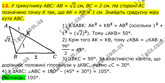 У трикутнику ABC: AB = √2 см, BC = 2 см. На стороні AC позначено точку K так, що AK = KB = 1 см. Знайдіть градусну міру кута ABC. 1) У ∆ABK: AK2 + KB2 = AB2 (оскільки 12 + 12 = (√2)2). Тому ∠AKB= 50°. 2) Крім того AK = KB, тому ∠KBA = ∠KAB = (90°)/2 = 45°. 3) ∠BKC = 90°. За властивістю катета, що дорівнює половині гіпотенузи у ∆КВС, маємо ∠C = 30°. 4) У ∆АВС: ∠ABC = 180° – (45° + 30°) = 105°. Відповідь: 105°.
