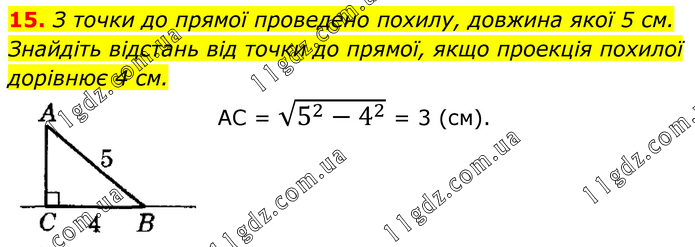 З точки до прямої проведено похилу, довжина якої 5 см. Знайдіть відстань від точки до прямої, якщо проекція похилої дорівнює 4 см. АС = √(5^2-4^2 ) = 3 (см).