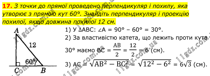 З точки до прямої проведено перпендикуляр і похилу, яка утворює з прямою кут 60°. Знайдіть перпендикуляр і проекцію похилої, якщо довжина похилої 12 см. 1) У ∆ABC: ∠A = 90° – 60° = 30°. 2) За властивістю катета, що лежить проти кута 30° маємо BC = АВ/2 = 12/2 = 6 (см). 3) AC = √(AB^2-〖ВС〗^2 ) = √(12^2-6^2 ) = 6√3 (см).