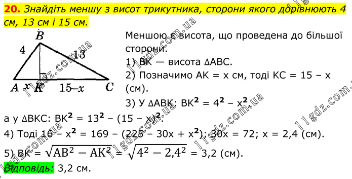 Знайдіть меншу з висот трикутника, сторони якого дорівнюють 4 см, 13 см і 15 см. Меншою є висота, що проведена до більшої сторони. 1) BK — висота ∆ABС. 2) Позначимо AK = х см, тоді KC = 15 – х (см). 3) У ∆АВК: BK2 = 42 – x2, а у ∆BKC: BK2 = 132 – (15 – х)2. 4) Тоді 16 – x2 = 169 – (225 – 30х + х2); 30х = 72; x = 2,4 (см). 5) BK = √(AB^2-AK^2 ) = √(4^2-〖2,4〗^2 ) = 3,2 (см). Відповідь: 3,2 см.