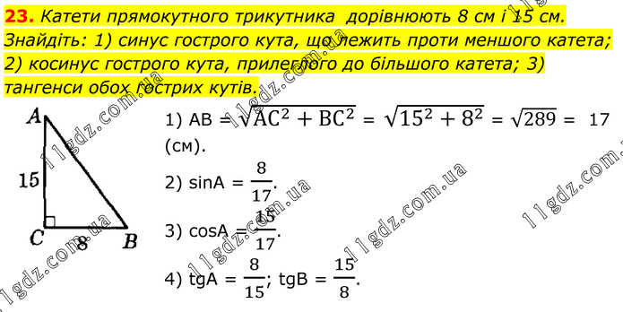Катети прямокутного трикутника дорівнюють 8 см і 15 см. Знайдіть: 1) синус гострого кута, що лежить проти меншого катета; 2) косинус гострого кута, прилеглого до більшого катета; 3) тангенси обох гострих кутів. 1) AB = √(AC^2+BC^2 ) = √(15^2+8^2 ) = √289 = 17 (см). 2) sinA = 8/17. 3) cosA = 15/17. 4) tgA = 8/15; tgB = 15/8.