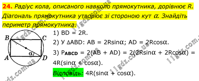 Радіус кола, описаного навколо прямокутника, дорівнює R. Діагональ прямокутника утворює зі стороною кут α. Знайдіть периметр прямокутника. 1) BD = 2R. 2) У ∆ABD: AB = 2Rsinα; AD = 2Rcosα. 3) PABCD = 2(АВ + AD) = 2(2Rsinα + 2Rcosα) = 4R(sinα + cosα). Відповідь: 4R(sinα + cosα).
