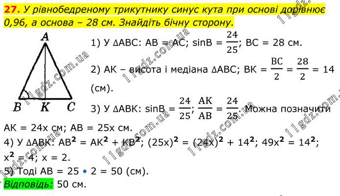 У рівнобедреному трикутнику синус кута при основі дорівнює 0,96, а основа – 28 см. Знайдіть бічну сторону. 1) У ∆АВС: АВ = АС; sinB = 24/25; BC = 28 см. 2) АК – висота і медіана ∆АВС; ВК = ВС/2 = 28/2 = 14 (см). 3) У ∆АВК: sinB = 24/25; AK/AB = 24/25. Можна позначити AК = 24х см; AB = 25х см. 4) У ∆АВК: AB2 = AK2 + KB2; (25х)2 = (24х)2 + 142; 49х2 = 142; х2 = 4; х = 2. 5) Тоді AB = 25 • 2 = 50 (см). Відповідь: 50 см.