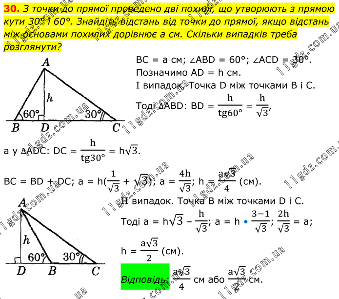 З точки до прямої проведено дві похилі, що утворюють з прямою кути 30° і 60°. Знайдіть відстань від точки до прямої, якщо відстань між основами похилих дорівнює a см. Скільки випадків треба розглянути? BC = а см; ∠ABD = 60°; ∠ACD = 30°. Позначимо AD = h см. І випадок. Точка D між точками В і С. Тоді ∆ABD: BD = h/(tg60°) = h/√3, a у ∆ADC: DC = h/(tg30°) = h√3. BC = BD + DC; a = h(1/√3 + √3); a = 4h/√3; h = (a√3)/4 (см). ІІ випадок. Точка В між точками D і C. Тоді a = h√3 – h/√3; a = h • (3-1)/√3; 2h/√3 = a; h = (a√3)/2 (см). Відповідь: (a√3)/4 см або (a√3)/2 см.