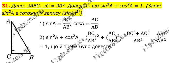 Дано: ∆ABC, ∠C = 90°. Доведіть, що sin2A + cos2A = 1. (Запис sin2A є тотожним запису (sinA)2.) 1) sinA = BC/AB; cosA = AC/AB. 2) sin2A + cos2A = (BC/AB)2 + (AC/AB)2 = (BC^2+ AC^2)/AB^2 = AB^2/AB^2 = 1, що й треба було довести.