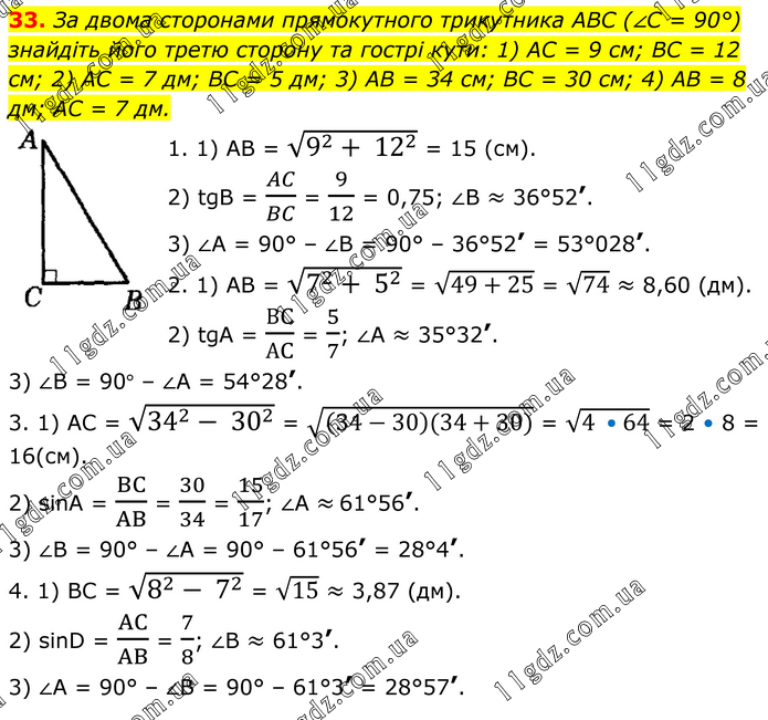 За двома сторонами прямокутного трикутника ABC (∠C = 90°) знайдіть його третю сторону та гострі кути: 1) AC = 9 см; BC = 12 см; 2) AC = 7 дм; BC = 5 дм; 3) AB = 34 см; BC = 30 см; 4) AB = 8 дм; AC = 7 дм. 1. 1) AB = √(9^2+ 12^2 ) = 15 (см). 2) tgB = AC/BC = 9/12 = 0,75; ∠B ≈ 36°52’. 3) ∠A = 90° – ∠B = 90° – 36°52’ = 53°028’. 2. 1) AB = √(7^2+ 5^2 ) = √(49+25) = √74 ≈ 8,60 (дм). 2) tgА = ВC/АC = 5/7; ∠А ≈ 35°32’. 3) ∠В = 90° – ∠А = 54°28’. 3. 1) AC = √(34^2- 30^2 ) = √((34-30)(34+30)) = √(4 •64) = 2 • 8 = 16(см). 2) sinA = BC/AB = 30/34 = 15/17; ∠A ≈ 61°56’. 3) ∠B = 90° – ∠A = 90° – 61°56’ = 28°4’. 4. 1) BC = √(8^2- 7^2 ) = √15 ≈ 3,87 (дм). 2) sinD = AC/AB = 7/8; ∠B ≈ 61°3’. 3) ∠A = 90° – ∠B = 90° – 61°3’ = 28°57’.