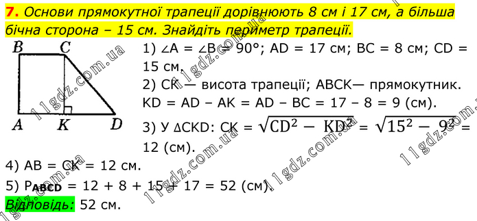 Основи прямокутної трапеції дорівнюють 8 см і 17 см, а більша бічна сторона – 15 см. Знайдіть периметр трапеції. 1) ∠A = ∠B = 90°; AD = 17 см; ВС = 8 см; CD = 15 см. 2) CК — висота трапеції; ABCK— прямокутник. KD = AD – AK = AD – BC = 17 – 8 = 9 (см). 3) У ∆CKD: CK = √(CD^2- KD^2 ) = √(15^2- 9^2 ) = 12 (см). 4) AB = CK = 12 см. 5) PABCD = 12 + 8 + 15 + 17 = 52 (см). Відповідь: 52 см.
