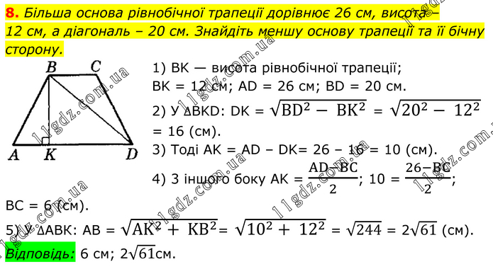 Більша основа рівнобічної трапеції дорівнює 26 см, висота – 12 см, а діагональ – 20 см. Знайдіть меншу основу трапеції та її бічну сторону. 1) BK — висота рівнобічної трапеції; BK = 12 см; AD = 26 см; BD = 20 см. 2) У ∆BKD: DK = √(BD^2- BK^2 ) = √(20^2- 12^2 ) = 16 (см). 3) Тоді AK = AD – DK= 26 – 16 = 10 (см). 4) 3 іншого боку AK = (AD-BC)/2; 10 = (26-BC)/2; BC = 6 (см). 5) У ∆АВК: AB = √(AK^2+ KB^2 )= √(10^2+ 12^2 ) = √244 = 2√61 (см). Відповідь: 6 см; 2√61см.