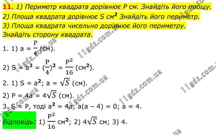 1) Периметр квадрата дорівнює P см. Знайдіть його площу. 2) Площа квадрата дорівнює S см2 Знайдіть його периметр. 3) Площа квадрата чисельно дорівнює його периметру. Знайдіть сторону квадрата. 1. 1) а = Р/4 (см). 2) S = a2 = (P/4)2 = P^2/16 (см2). 2. 1) S = a2; a = √S (см). 2) Р = 4а = 4√S (см). 3. S = P, тоді а2 = 4а; а(а – 4) = 0; а = 4. Відповідь: 1) P^2/16 см2; 2) 4√S см; 3) 4.
