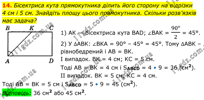 Бісектриса кута прямокутника ділить його сторону на відрізки 4 см і 5 см. Знайдіть площу цього прямокутника. Скільки розв’язків має задача? 1) AK — бісектриса кута BAD; ∠BAK = (90°)/2 = 45°. 2) У ∆ABK: ∠BKA = 90° – 45° = 45°. Тому ∆ABK – рівнобедрений і AB = BK. I випадок. BK = 4 см; KC = 5 см. Тоді AB = BK = 4 см і SABCD = 4 • 9 = 36 (см2). II випадок. BK = 5 см; KC = 4 см. Тоді AB = BK = 5 см і SABCD = 5 • 9 = 45 (см2). Відповідь: 36 см2 або 45 см2.