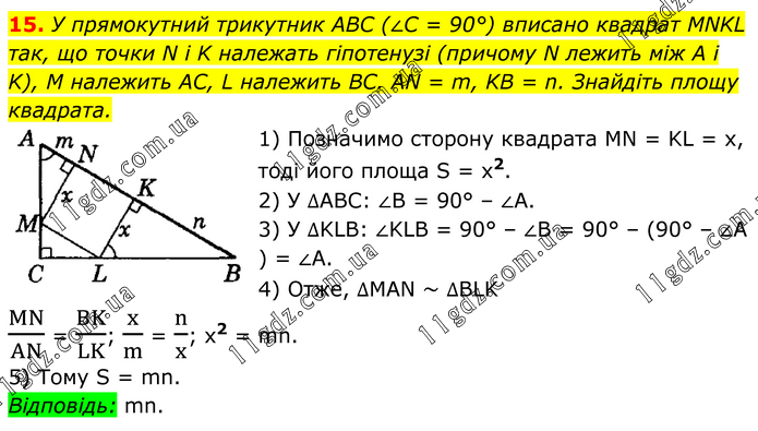 У прямокутний трикутник ABC (∠C = 90°) вписано квадрат MNKL так, що точки N і K належать гіпотенузі (причому N лежить між A і K), M належить AC, L належить BC. AN = m, KB = n. Знайдіть площу квадрата. 1) Позначимо сторону квадрата MN = KL = х, тоді його площа S = х2. 2) У ∆АВС: ∠B = 90° – ∠A. 3) У ∆KLB: ∠KLB = 90° – ∠B = 90° – (90° – ∠A ) = ∠A. 4) Отже, ∆MAN ~ ∆BLK MN/AN = BK/LK; x/m = n/x; x2 = mn. 5) Тому S = mn. Відповідь: mn.