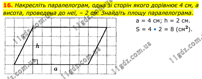 Накресліть паралелограм, одна зі сторін якого дорівнює 4 см, а висота, проведена до неї, – 2 см. Знайдіть площу паралелограма. a = 4 см; h = 2 см. S = 4 • 2 = 8 (см2).