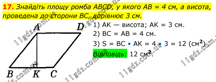 Знайдіть площу ромба ABCD, у якого AB = 4 см, а висота, проведена до сторони BC, дорівнює 3 см. 1) AK — висота; AK = 3 см. 2) BC = AB = 4 см. 3) S = BC • AK = 4 • 3 = 12 (см2) . Відповідь: 12 см2.