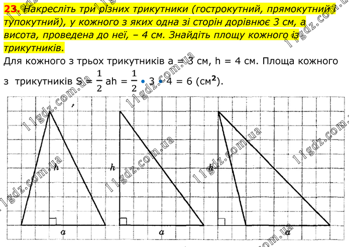 Накресліть три різних трикутники (гострокутний, прямокутний і тупокутний), у кожного з яких одна зі сторін дорівнює 3 см, а висота, проведена до неї, – 4 см. Знайдіть площу кожного із трикутників. Для кожного з трьох трикутників a = 3 см, h = 4 см. Площа кожного з трикутників S = 1/2 ah = 1/2 • 3 • 4 = 6 (см2).