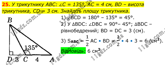 У трикутнику ABC: ∠C = 135°, AC = 4 см, BD – висота трикутника, CD = 3 см. Знайдіть площу трикутника. 1) ∠BCD = 180° – 135° = 45°. 2) У ∆BDC: ∠DBC = 90°– 45°; ∆BDC – рівнобедрений; BD = DC = 3 (см). 3) SАВС = 1/2 AC • BD = 1/2 • 4 • 3 = 6 (см2). Відповідь: 6 см2.